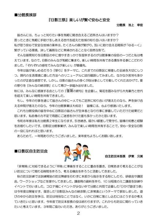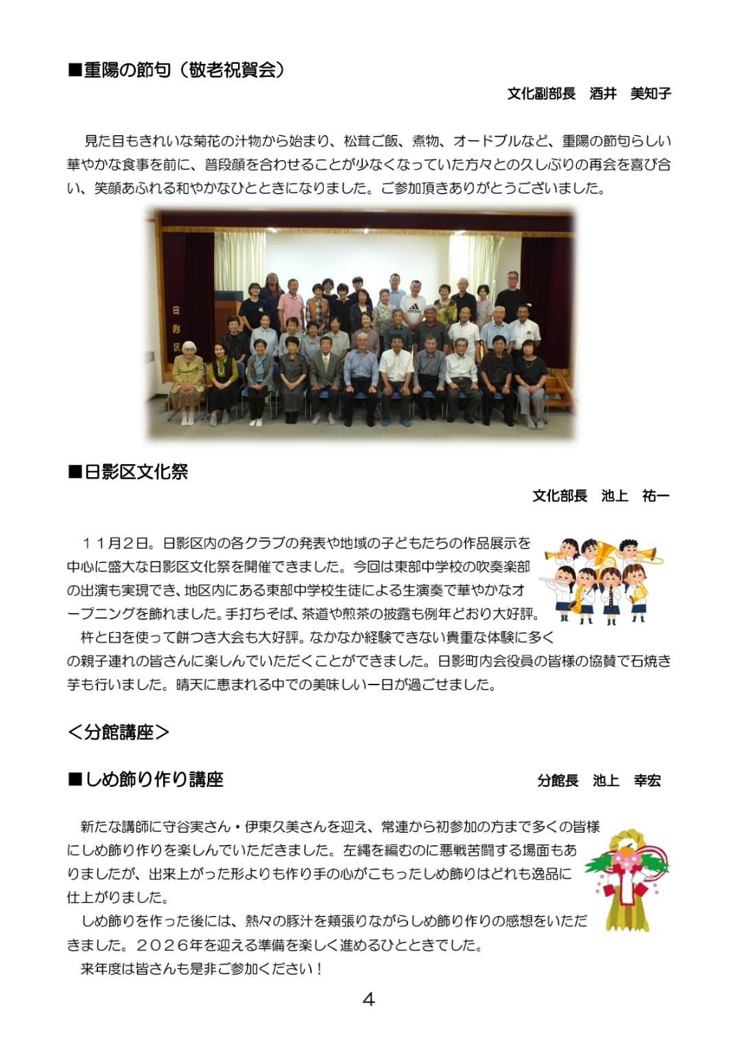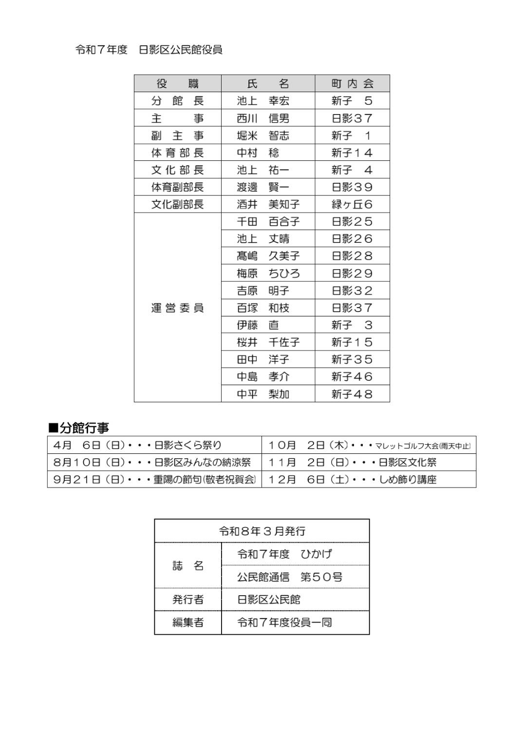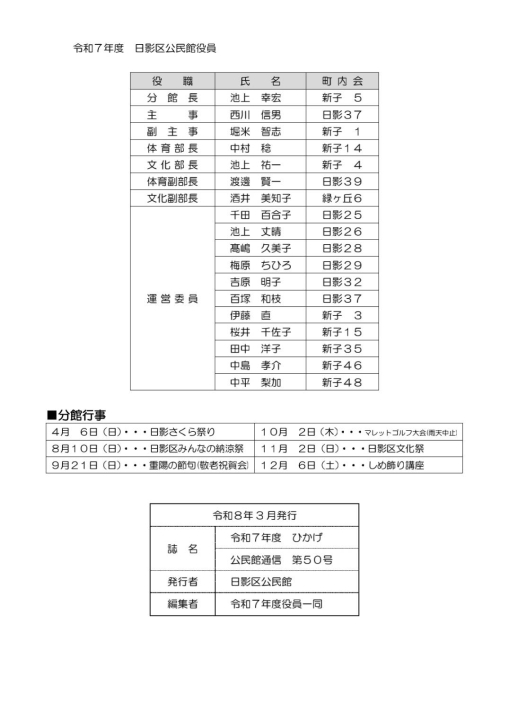 公民館通信 50号 令和7年度公民館活動をまとめた、日影区公民館通信を発行しました。賛否両論ではありますが、久々に納涼祭が開催されました。その他、クラブ活動については新クラブもく加わるなどして1年間締めくくりました。ご興味のある方は、是非1度覗いて見て頂けたらと思います。